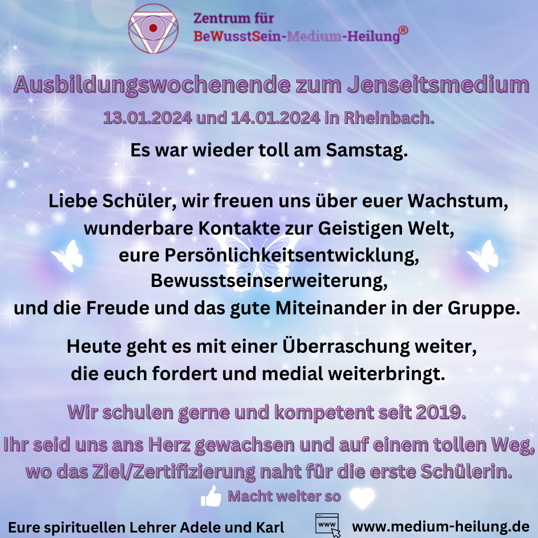 Es war ein wunderschönes Wochenende mit unseren Schülern und in der Verbindung mit der Geistigen Welt. Weiter geht es im Januar 2020 in der nun folgenden Block-Ausblidung.