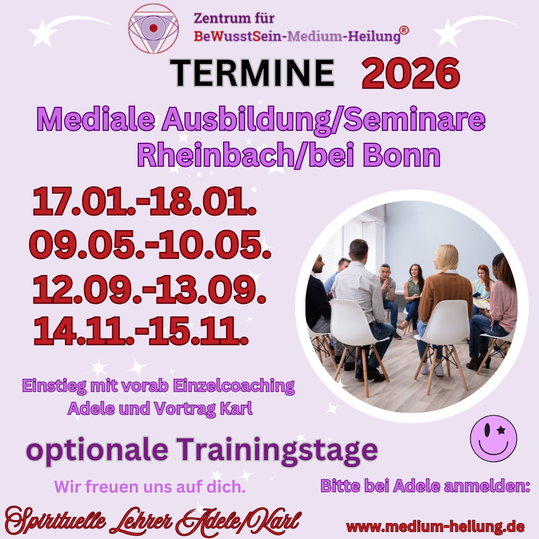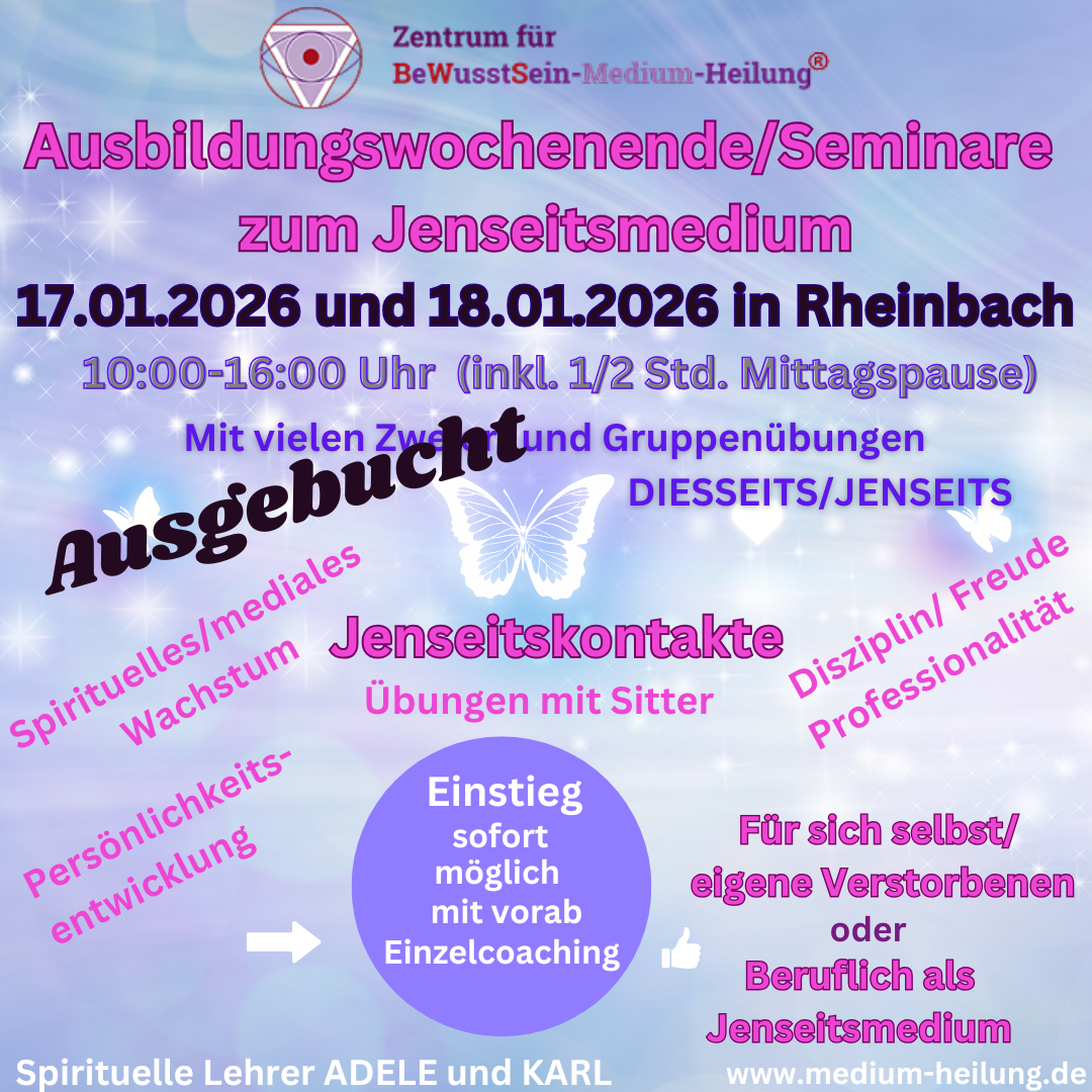 Seit 2019 bieten wir -Adele und Karl- die Ausbildung / mediale Seminare zum Jenseitskontaktmedium (spirituelles Medium) nach britischer Tradition in Theorie und Praxis an.