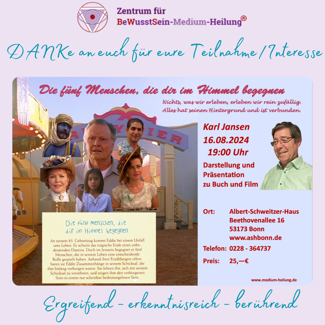 Am 02.06.2019 hielt Karl auf dem Kongress "Spektrum der Spiritualität 2019" die Vorlesung zum Buch "Die 5 Menschen, die dir im Himmel begegnen" in einem gut gefüllten Saal. Er hat sich sehr über das große Interesse gefreut. Die Menschen waren sehr berührt über die Aussage des Buches, das kein Leben sinnlos ist und alles miteinander verbunden ist. Diese hat sie sehr angesprochen.