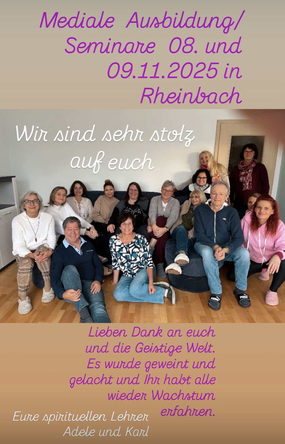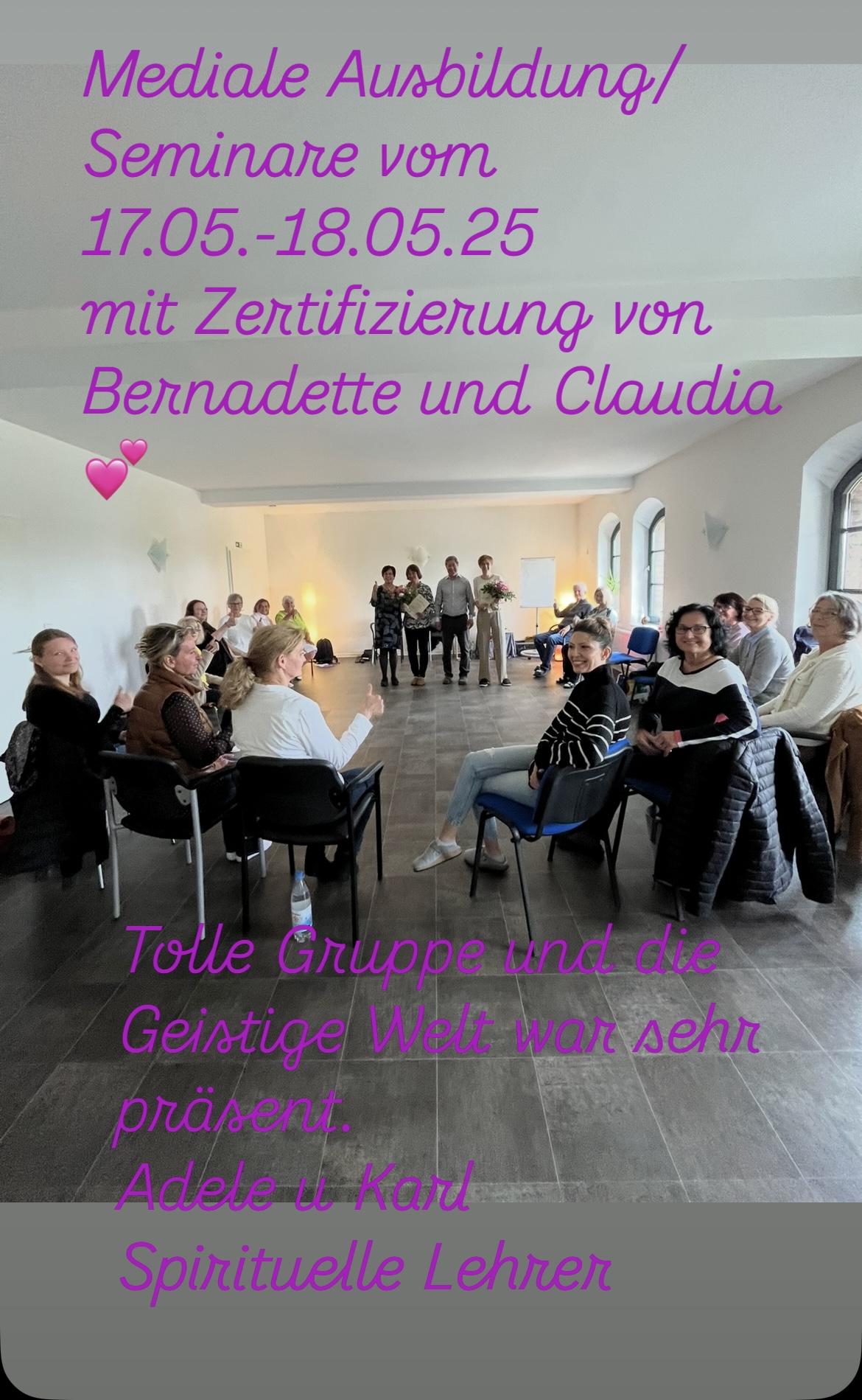 Erstmalig hielten wir in Trier am 19.05.2019 in der Praxis reset your life bei Frau Anne-Marie Seekings einen Medialen Nachmittag. Der Raum war gut gefüllt, in einer schönen Atmosphäre mit sehr offenen und interessierten Teilnehmern. Unsere Vorträge wurden sehr gut angenommen und viele Fragen gestellt. Im zweiten Teil durften wir viele berührende Botschaften aus der Geistigen Welt an vereinzelte Teilnehmer weiter geben. Es wurde geweint und es wurde gelacht. Ebenfalls wurde Adele's Buch gerne gekauft.Da Frau Seekings mediale Chakren-Workshops durchführt, war die Thematik über Spiritualität und Medialität den Teilnehmer schon bekannt. Lieben Dank für den schönen Nachmittag. Danke an die Geistige Welt. Wir sehen uns wieder am 04. August 2019.