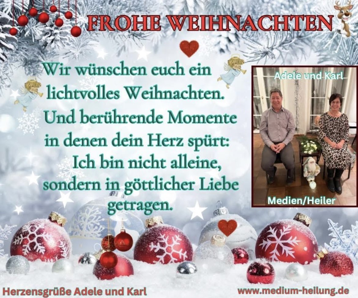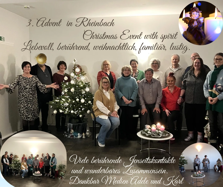 Christmas Time with spirit am 14.12.2025, 3. Advent, in Rheinbach. Es war ein wunderschönes, weihnachtliches Event mit einem tollen Publikum und so schöne Botschaften durften wir übermitteln von: Oma, Opa, Mamas, Papas, Schwiegervater, Kindchen, Onkel. Es war sehr berührend und wir danken der Geistigen Welt für ihre starke Präsenz. Auch unsere schöne Weihnachtsgeschichte und später unser lustiges Weihnachtsgedicht fanden großen Anklang. Danach saßen wir noch gemütlich in Weihnachtsstimmung zusammen. Und besonders stark war die Erinnerung an alte Zeiten, mit Werten und Traditionen. Es war so schön, der Flair von Liebe und Frieden erfüllte den Raum. Das ist Weihnachten.
