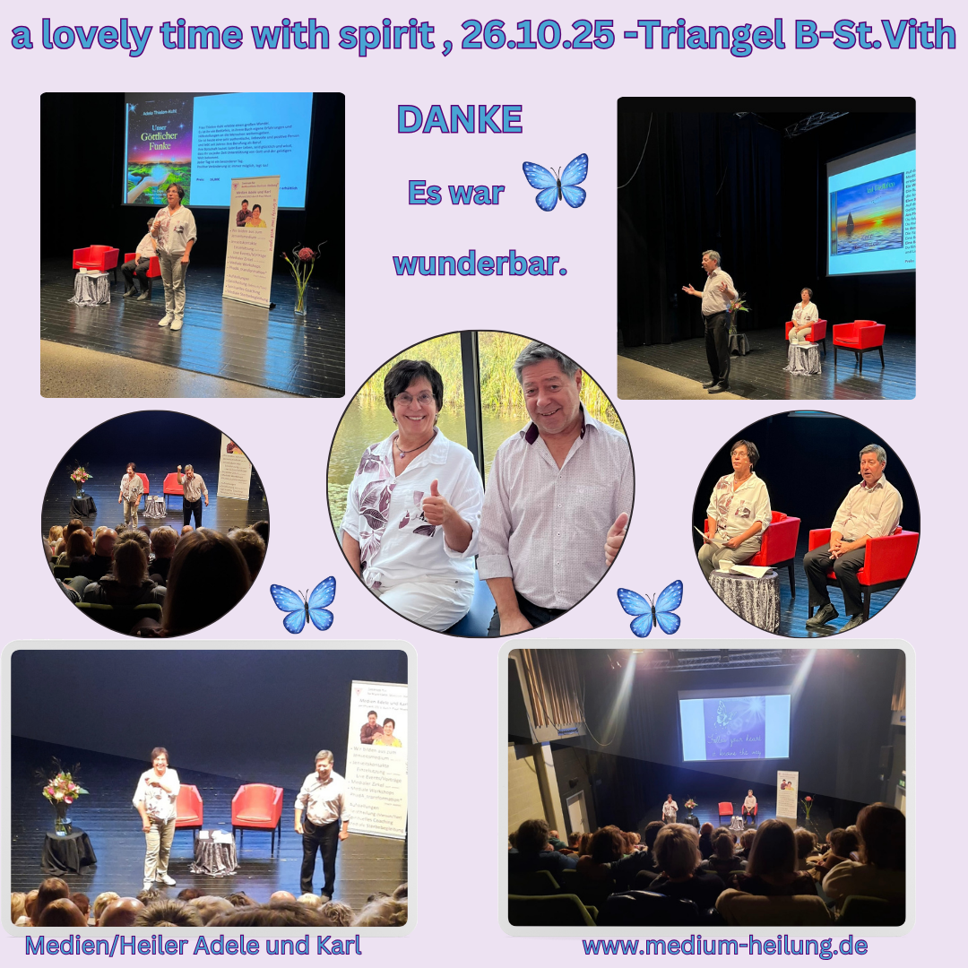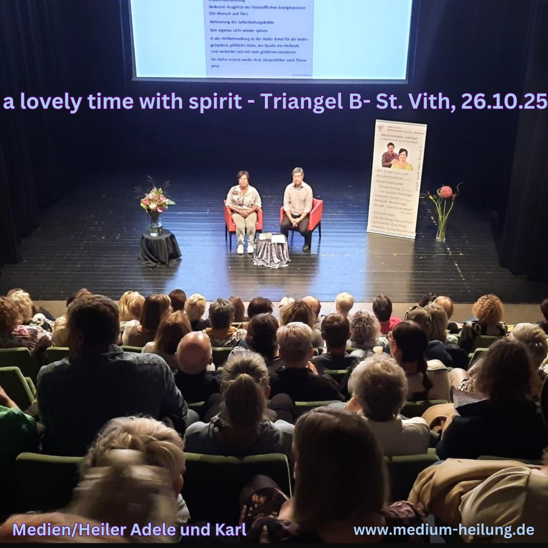 Zum zweiten Male hielten wir im Kultur-, Konferenz & Messezentrum Triangel in St. Vith in Belgien einen medialen Abend. Der Saal hat aufsteigende Sitzreihen wie ein Kinosaal und war gut gefüllt. Die Vorträge wurden gut angenommen und viele Fragen zur Geistigen Welt gestellt. Im zweiten Teil wurden Botschaften aus der Geistigen Welt an vereinzelte Anwesende weiter gegeben. Es war eine tolle Atmosphäre im Saal und das Publikum war sehr aufgeschlossen. Das Interesse an Adele's Buch war sehr groß. Die mediale Arbeit hat uns sehr viel Freude gemacht und wir hatten sehr viel Unterstützung aus der Geistigen Welt. Wir wurden mehrfach angesprochen, ob es ein Wiedersehen im Triangel gibt, und wir freuen uns auf den nächsten medialen Abend am 04.06.2020.