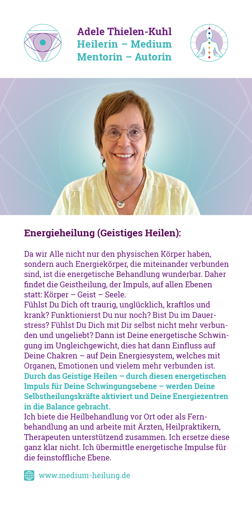 Zuerst eine wichtige Information: Ich unterstütze Dich von Herzen gerne als Heilerin und praktiziere schon seit sehr vielen Jahren. Jedoch ersetze ich weder die Behandlung beim Arzt oder Heilpraktiker, ebenfalls gebe ich keine Diagnosen. Ich biete Dir gerne zusätzlich zur Unterstützung Deiner Selbstheilungskräfte Heilbehandlungen vor Ort an, oder als Fernbehandlung – da Energie nicht von Raum und Zeit abhängig ist. Die Zusammenarbeit mit Ärzten, Psychologen und Heilpraktikern hat sich erweitert, worüber ich mich sehr freue. | ||||||