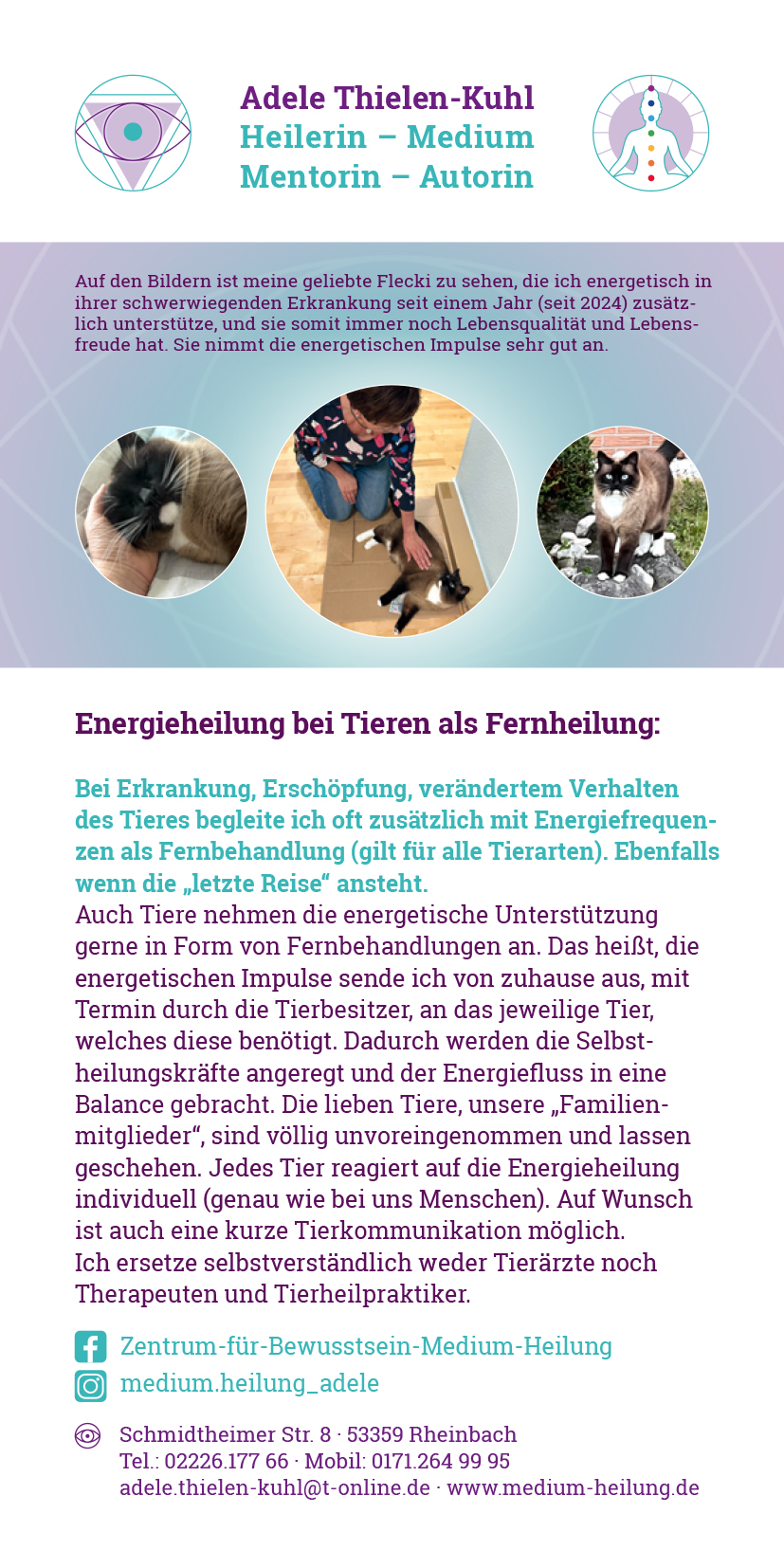 Auch Tiere nehmen die energetische Unterstützung gerne in Form von Fernbehandlungen an, sie sind völlig unvoreingenommen und lassen geschehen. Ebenfalls habe ich mehrere Seminare zur Tierkommunikation besucht. Und auch meine liebe Flecki kommuniziert sehr deutlich. Leider ist sie am 27.09.2025 über die Regenbogenbrücke gegangen. Es ist so tröstlich, dass wir weiterhin seelisch in Verbindung und Kommunikation sind. Die Liebe bleibt. | ||||||