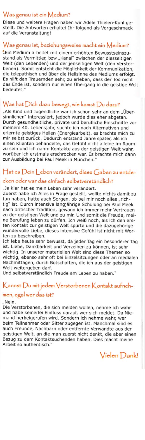 Vom Albert-Schweitzer-Haus in Bonn Bad-Godesberg wurde Adele im Frühjahr 2018 in einem Interview dazu befragt, was ein Medium ist und wie sie dazu gekommen